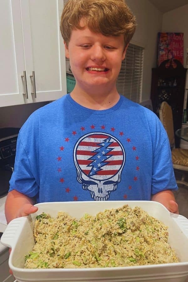 Turns out, adding cauliflower rice transforms a good casserole into dinner GOLD. It’s like Chicken Divan and Chicken Bacon Ranch had a low-carb baby, and that baby is delicious.